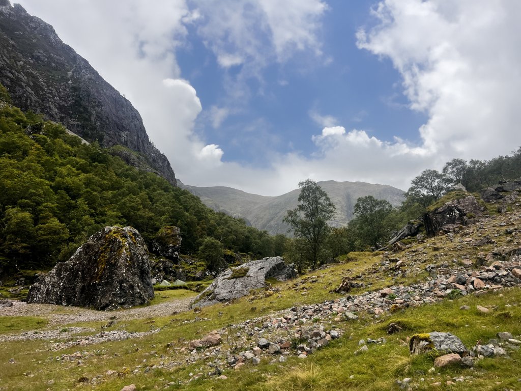 From the car park, the path begins with a descent towards the River Coe on a very clear track. The views almost immediately become impressive, with towering cliffs and a deep glen unfolding before you.