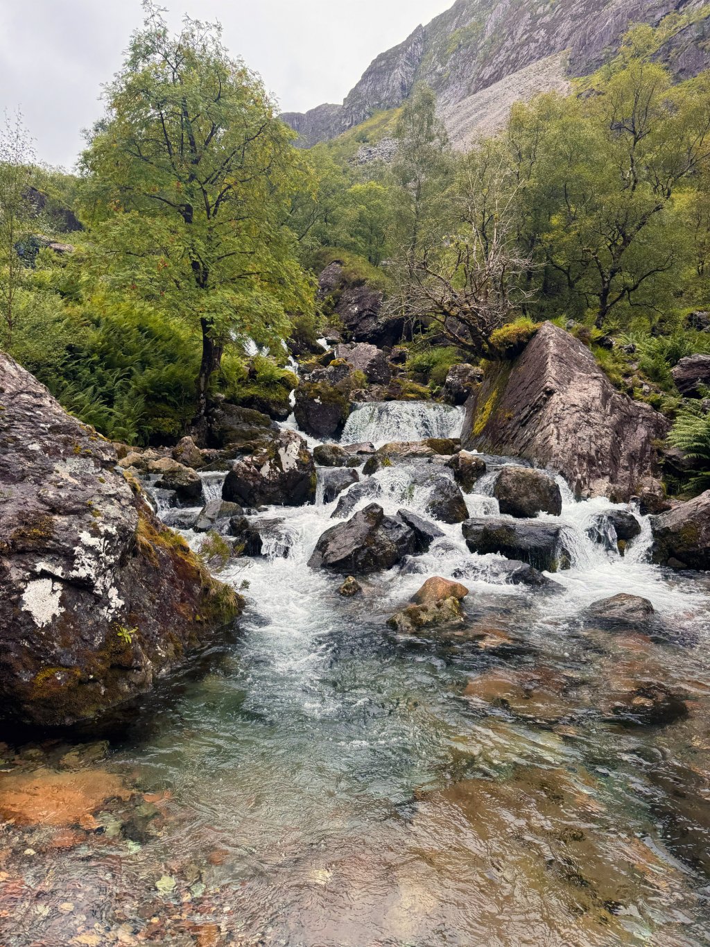 After finding your way through the boulders, the path crosses a shallow part of the burn and some falls. There are rocks in the water that were placed by previous walks, but be careful. If you keep your boots on, be prepared to get them wet. Quite often, people are found here taking a break and walking barefoot across the water.