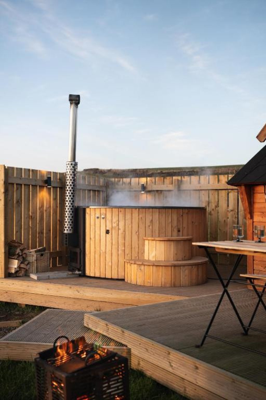 Private wood-fired hot tub ready on arrival, with privacy fencing and exterior lighting for ambience.