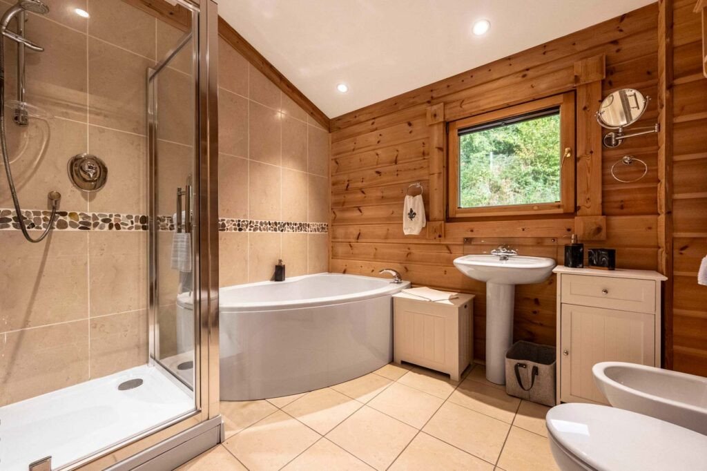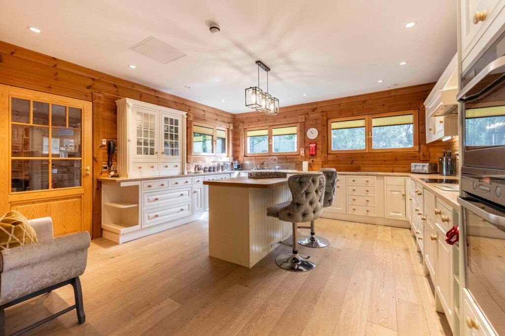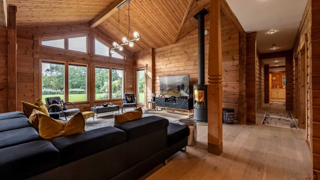 The open-plan living, dining and kitchen area is generous, bright, with a wood-burning stove, 65″ Smart TV, SONOS sound system, and soft velvet furnishings.