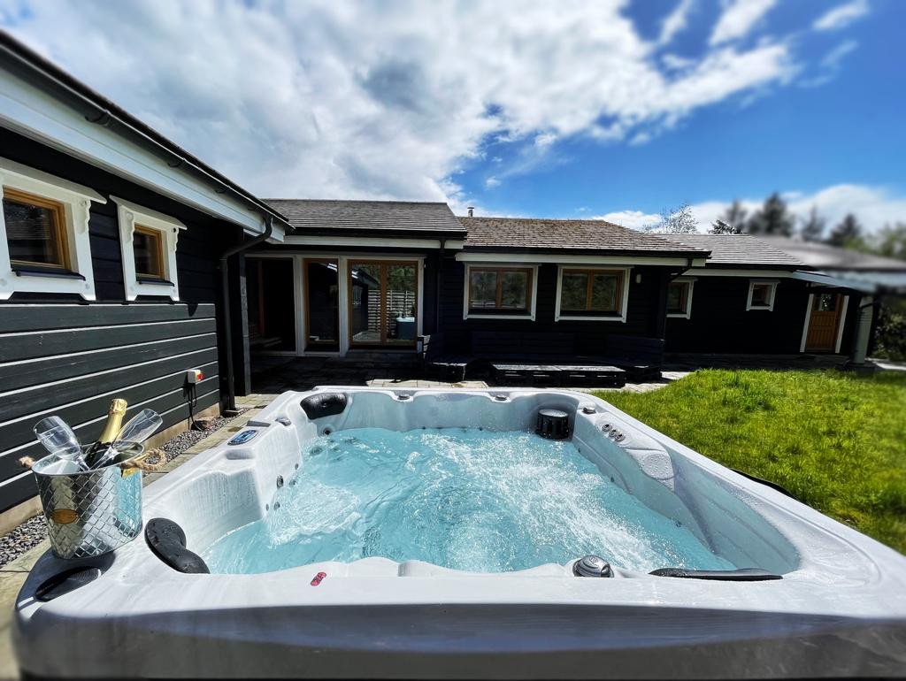 Outdoor hot tub overlooking Loch Kishorn, ideal for relaxing evenings.