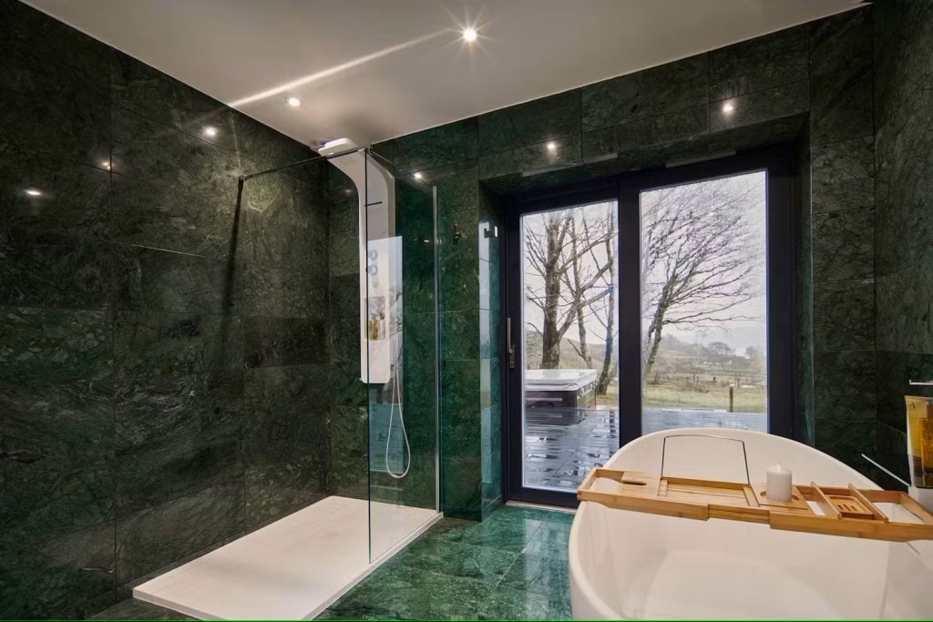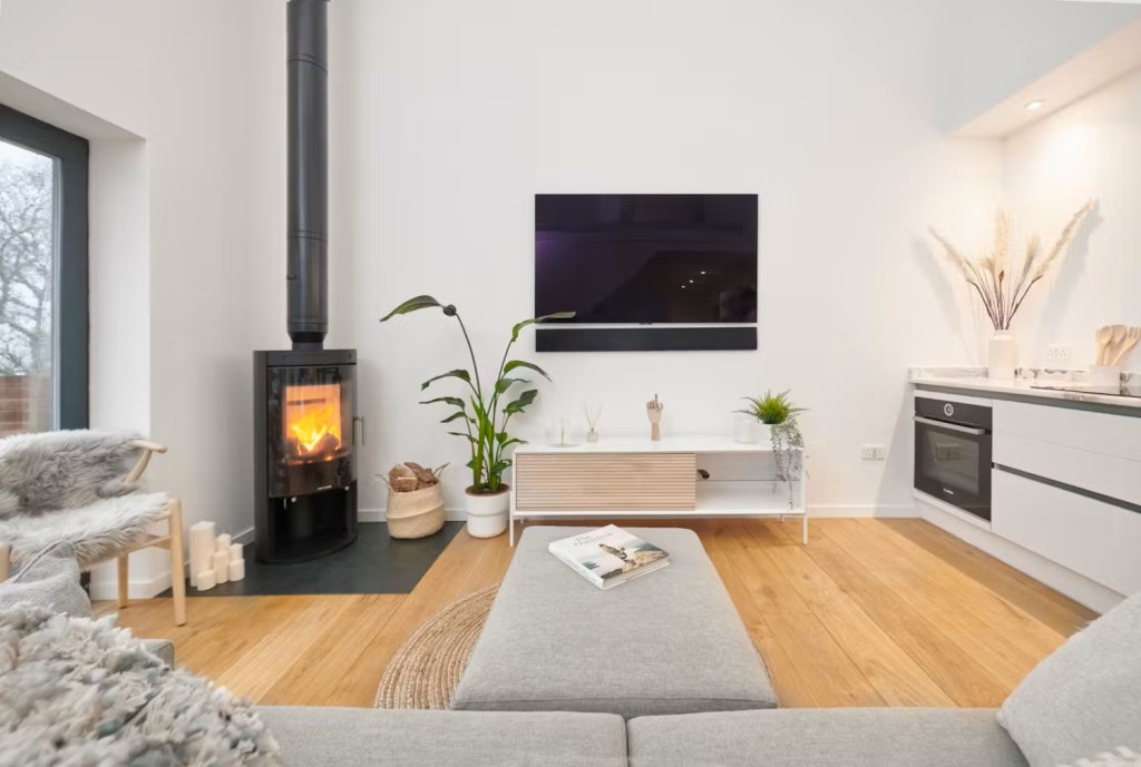 The open-plan living area features a cosy wood burner, creating a warm atmosphere for relaxing evenings. The kitchen is fully equipped, allowing guests to prepare meals with ease. Large glass doors open onto a private deck, offering stunning sea views and seamless indoor-outdoor living.