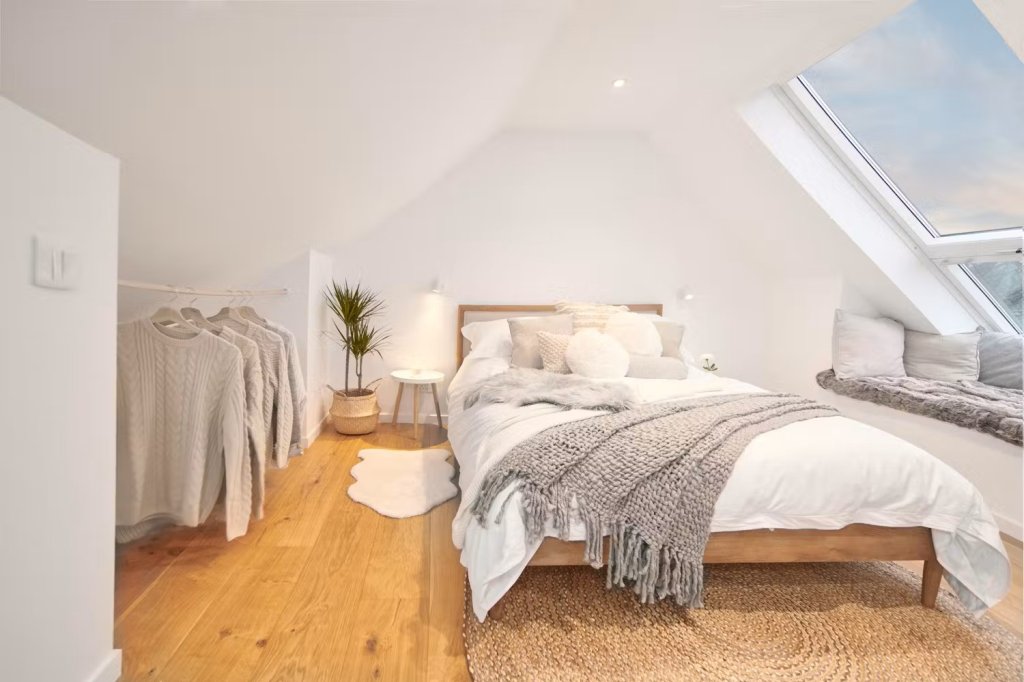 Upstairs, the elegant king-size bedroom serves as a peaceful sanctuary. A Juliet balcony and window seat provide panoramic views of the surrounding landscape. The spacious bathroom boasts a freestanding bathtub, rainfall shower, and dual sinks, all complemented by sea and mountain vistas.